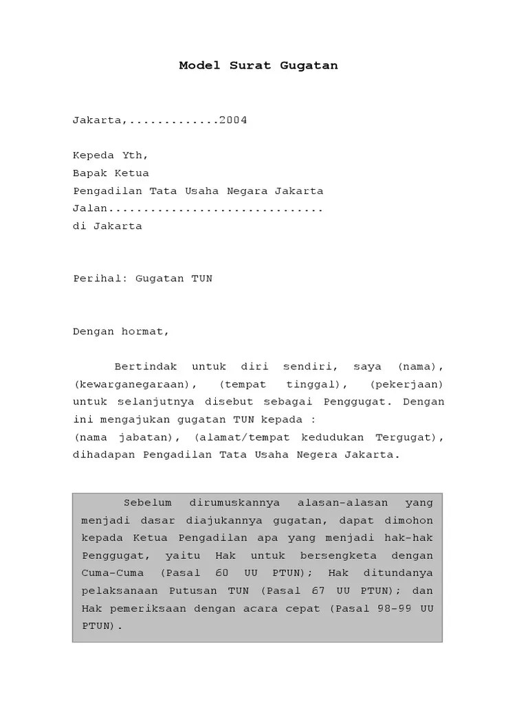 Contoh surat gugatan ptun doc sentra primer baru timur pulo gebang 13950 jakarta timur. Surat gugatan merupakan pengantar ke proses pemeriksaan di muka ptun. Ketua pengadilan tata usaha negara pekanbaru jalan hr. Purwokerto, 20 oktober 2009 perihal: Kepada yth, ketua pengadilan tata usaha negeri bandung.